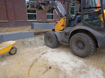 1) Bij slechte ondergrond eerst 2 beddingen neerleggen.2) Hierop 2 balken wegleggen om het 1e element op te plaatsen.